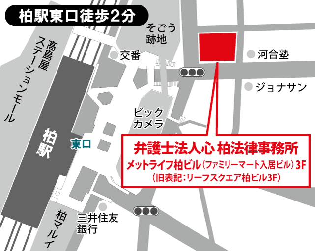 完済済みの債務について過払い金返還請求をされる場合,当ページにあります事務所までお越しいただくほか,お電話でご相談いただくこともできます。柏から事務所までお越しになる場合は,事前に地図や事務所の外観をお確かめください。